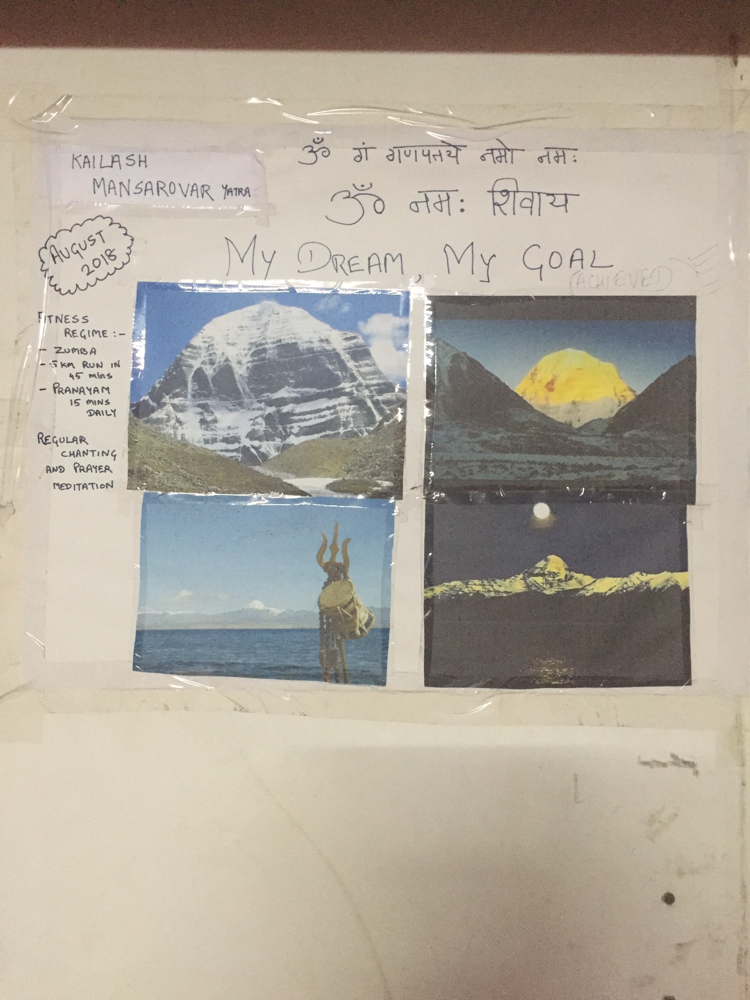 I first made a chart with pictures of Mount Kailash and Lake Mansarovar and along with that wrote down my goals for the next 8 months which included my fitness regime…Zumba sessions three times a week ,a regular 5km walk on the days ,I didn’t go for Zumba and climbing steps everyday…as I lived on the sixth floor,I put a target of climbing six floors,six times at a stretch…all this for physical fitness but what was more important was the mental fitness…the endurance level which will help you push yourself further when your physical body is tired…so I decided to meditate on HIS name the most powerful mantra as far as I think so…AUM NAMAH SHIVAYA…regular chanting and prayers really helped as so many factors have to fall in place for such a Yatra to happen successfully. Here I will also mention the importance of doing Pranayama ten minutes in the morning and again ten minutes in the evening…it helps you control your breath and increases the lung capacity.My diet along with intermittent fasting helped me immensely.